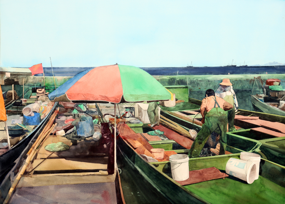 作品《溇港》取材于湖州太湖边渔民劳作景象,画面色调温润柔和,既还原了太湖溇港的自然风貌,又通过色彩的层次变化,凸显出渔民劳作的质朴与坚韧,传递出对江南水乡民俗文化的深切眷恋,以及对平凡劳动者的敬意。作品以写实为基、写意为辅,将生活场景转化为富有感染力的艺术语言,契合了展览“深入生活、扎根人民”的创作导向,展现出我院教师美术创作中对本土题材的深耕与艺术表达的创新探索。(文/方璐琪)