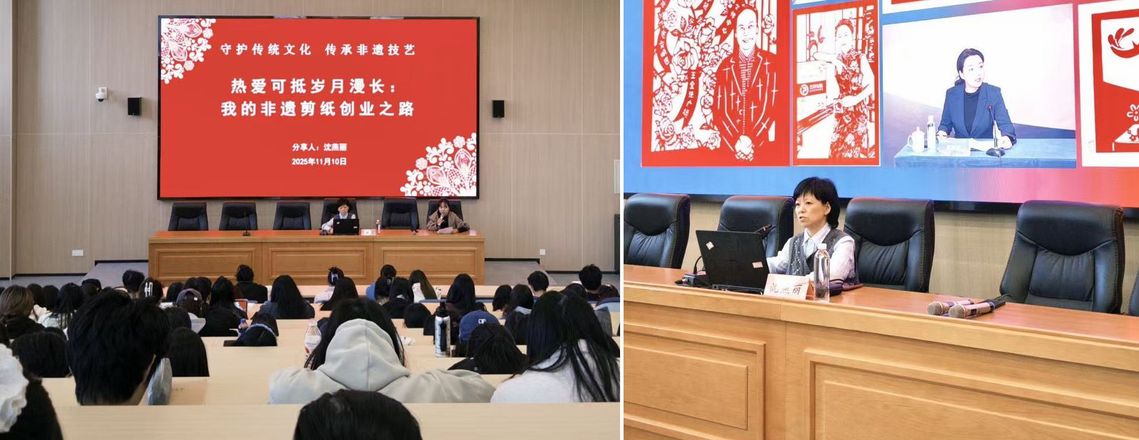 讲座以“热爱的核心驱动力”开篇,沈燕丽分享了童年与剪纸结缘的经历,强调“热爱是非遗传承的底色,更是创业的持久动力”。这份热爱支撑她从民间爱好者成长为行业标杆,构建非遗传承与产业发展的生态链。她详细讲解了自己的运营模式,团队业务涵盖剪纸创作、文创开发、艺术展览,累计获国家、省、市荣誉40余项。通过“人物定制”剪纸案例,她展示如何将湖州本土文化元素与现代设计结合,为艺术学子示范“文化符号转化为市场产品”的实践路径。谈及创业突破,她分享了作品助力巴黎奥运会、中网巡回赛等重大赛事的经历,慈善拍卖作品成交价超2万元。她鼓励同学们“艺术创作要敢破圈,让传统技艺在时代需求中焕发新生。”讲座尾声,她开放交流渠道,为同学们提供非遗实践与职业发展平台。